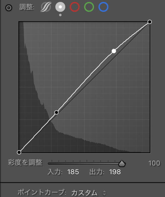 次に、トーンカーブで明暗の流れを微調整します。特定の場所の明るさを調整する場合、基本補正の項目よりトーンカーブの方が調整がしやすいです。